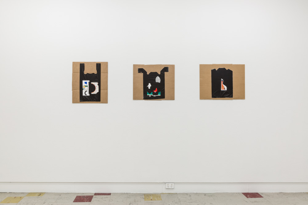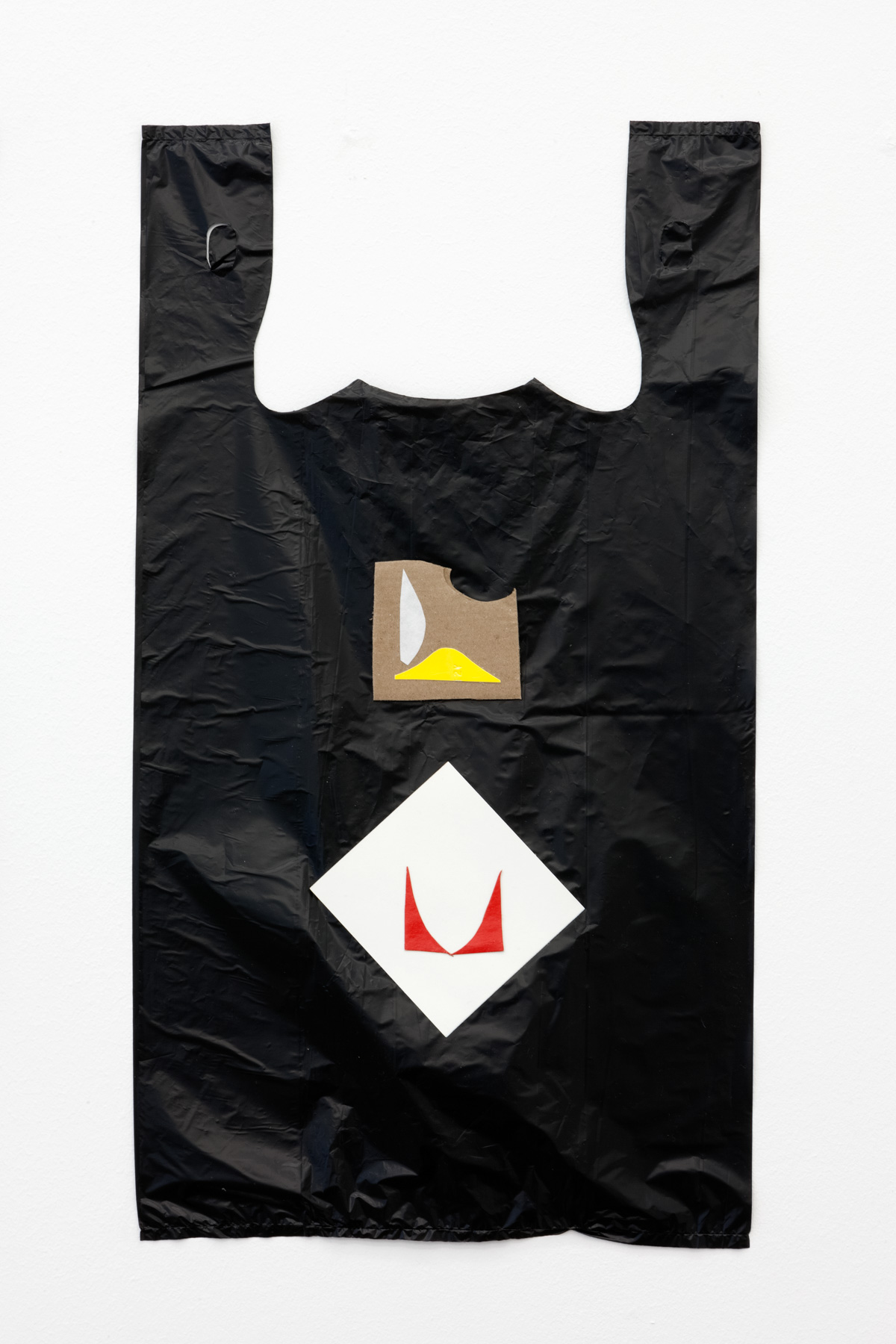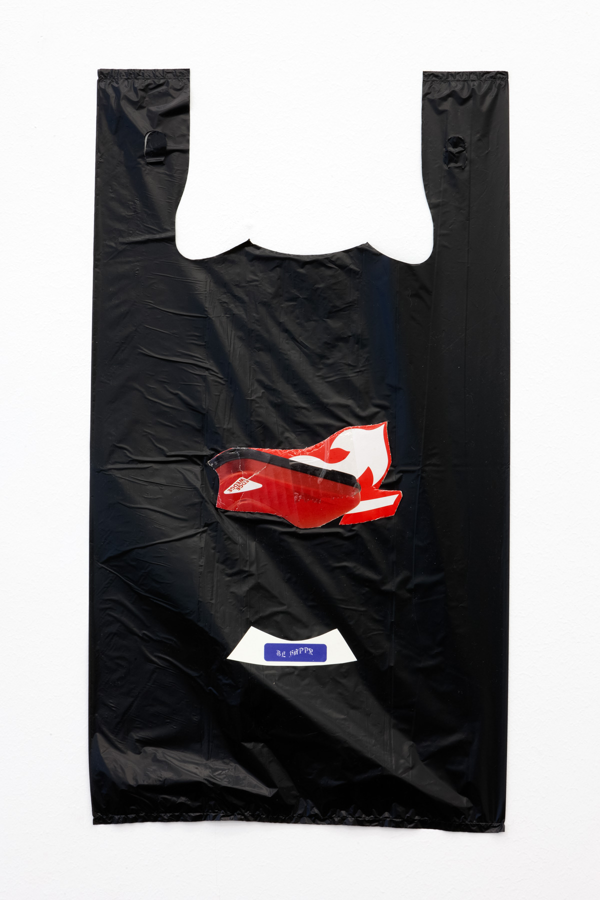 Thank You for Shopping with Us, a solo exhibition by Thomas Kong in the Atrium Gallery. The exhibition presents black plastic bags and collages, using immediate and seemingly disposable materials, created in 2022.
