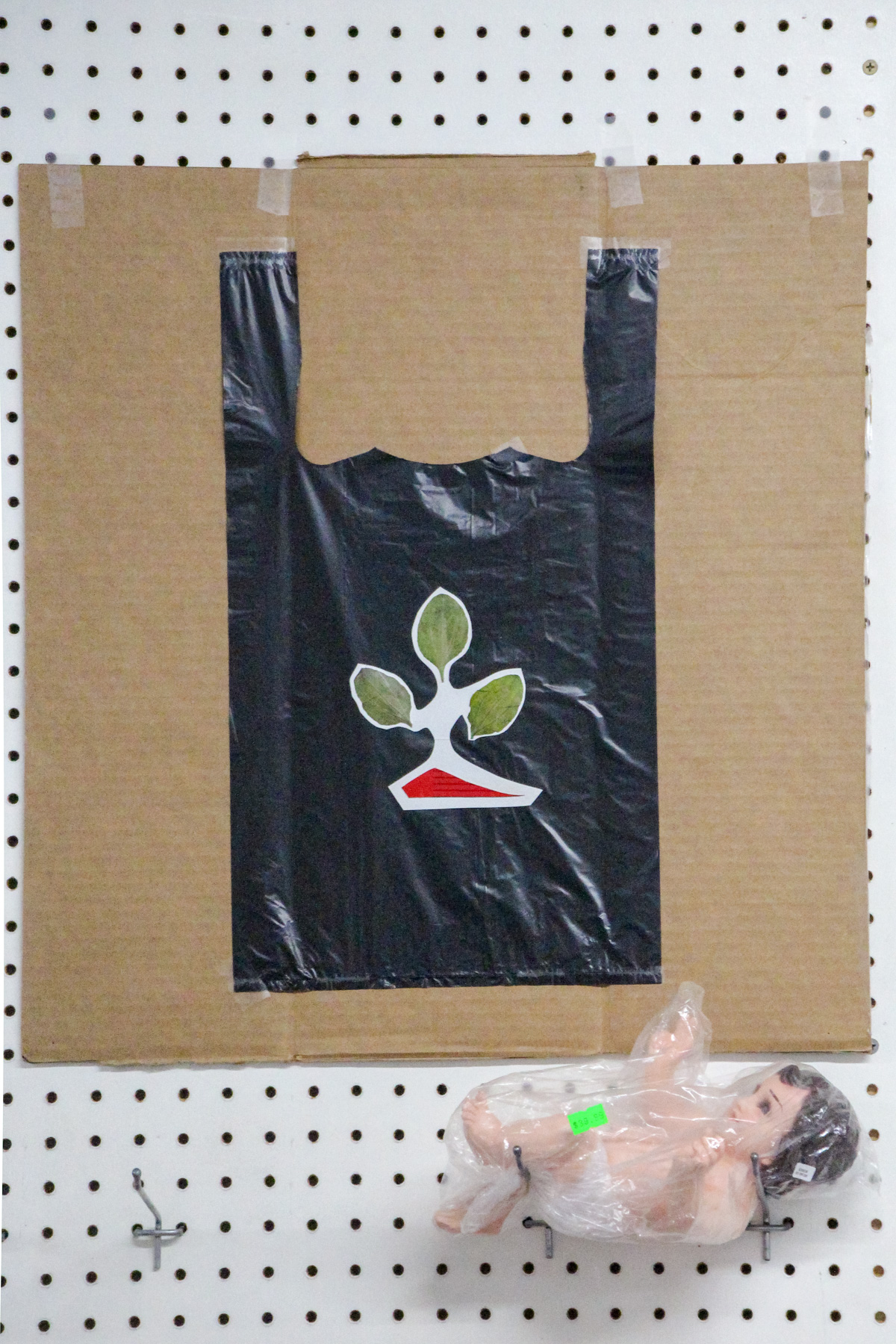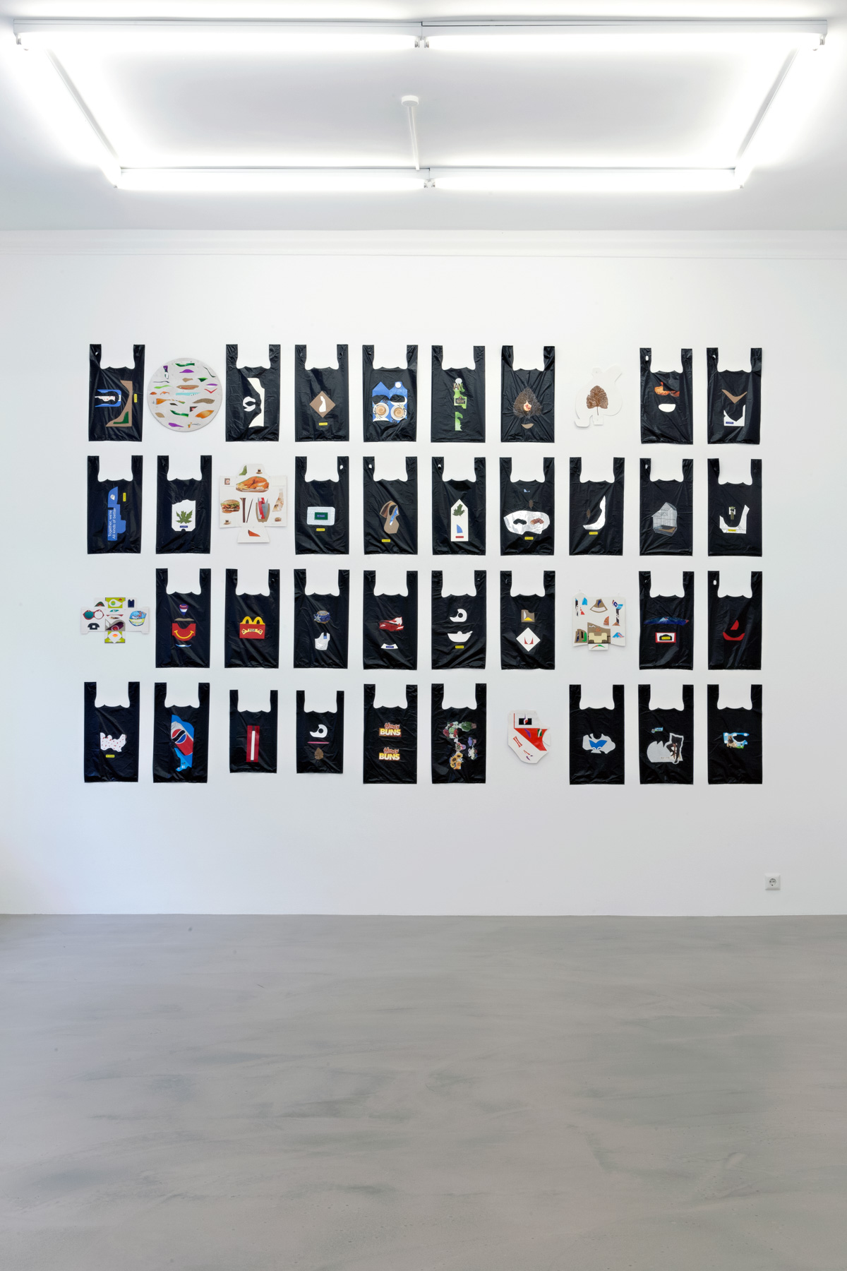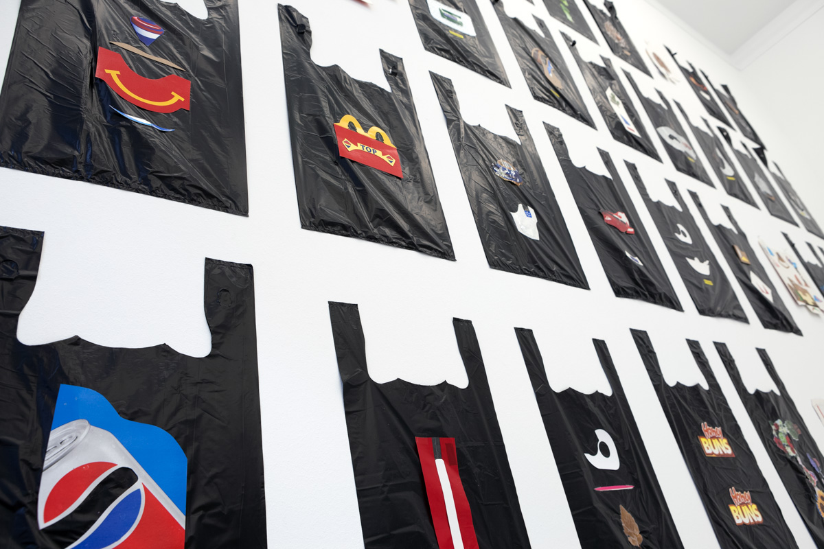 Thank You for Shopping with Us, a solo exhibition by Thomas Kong in the Atrium Gallery. The exhibition presents black plastic bags and collages, using immediate and seemingly disposable materials, created in 2022.