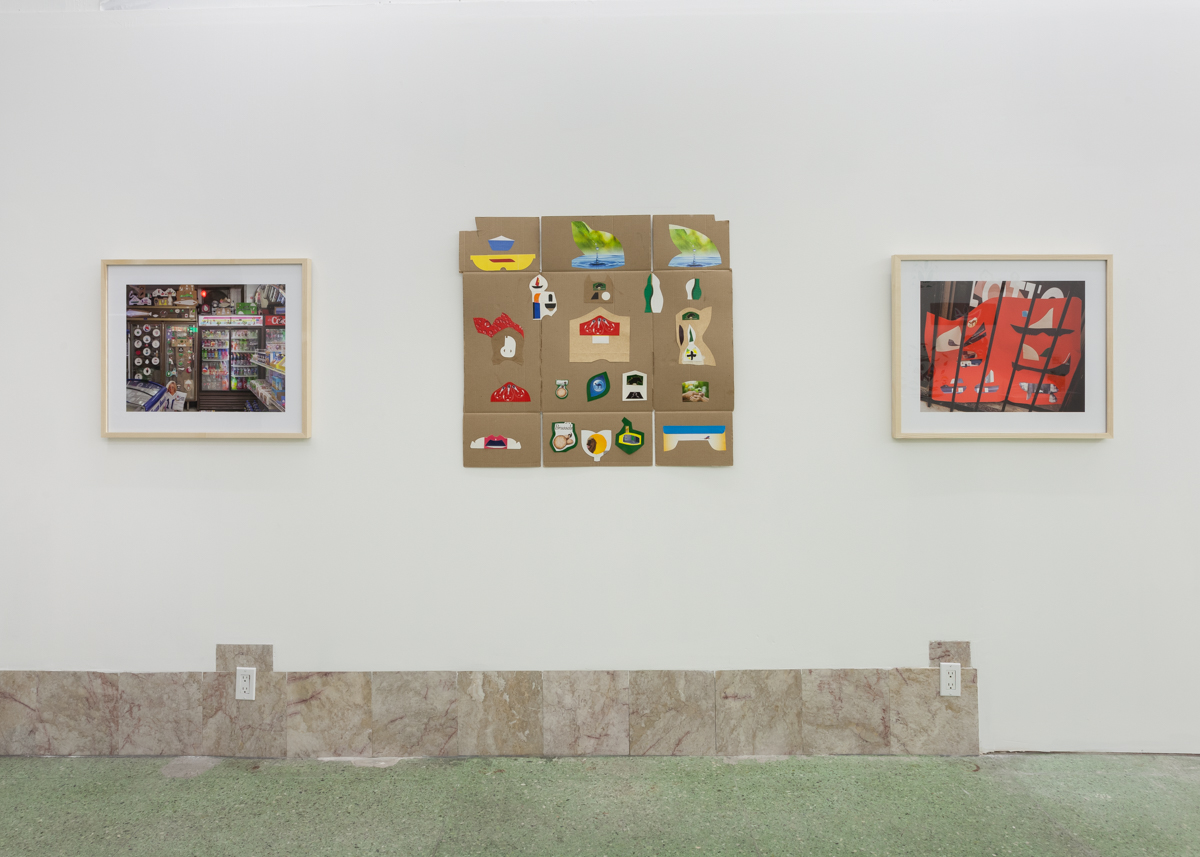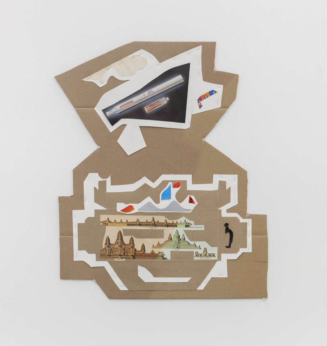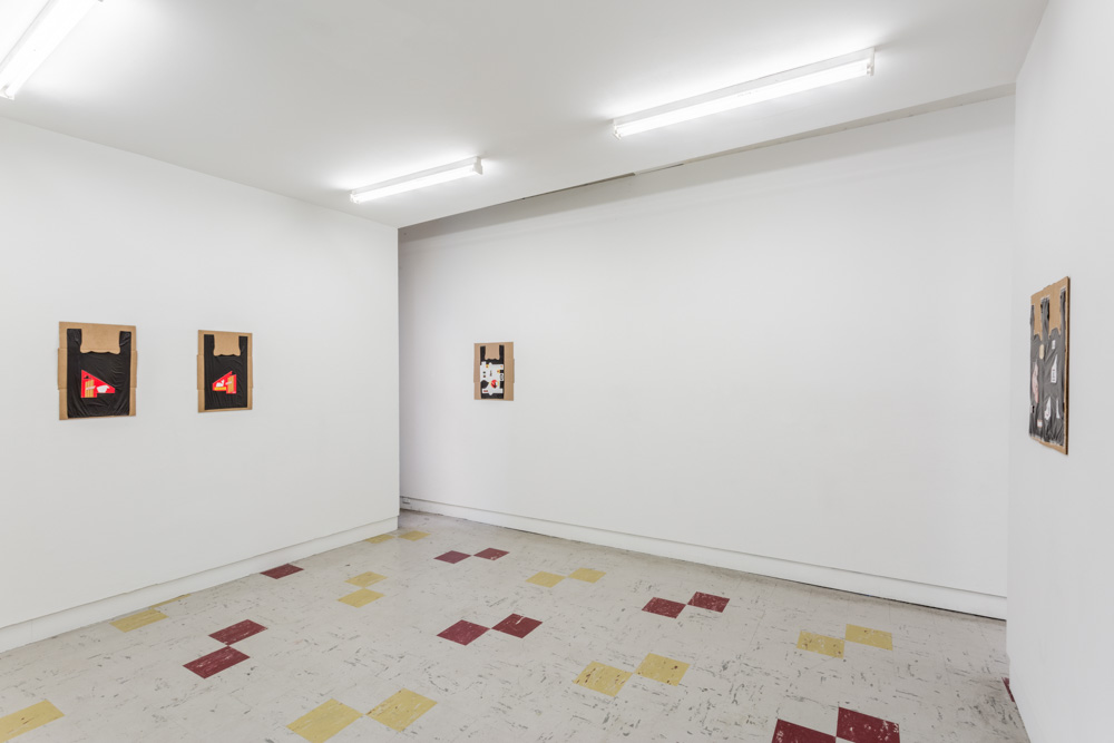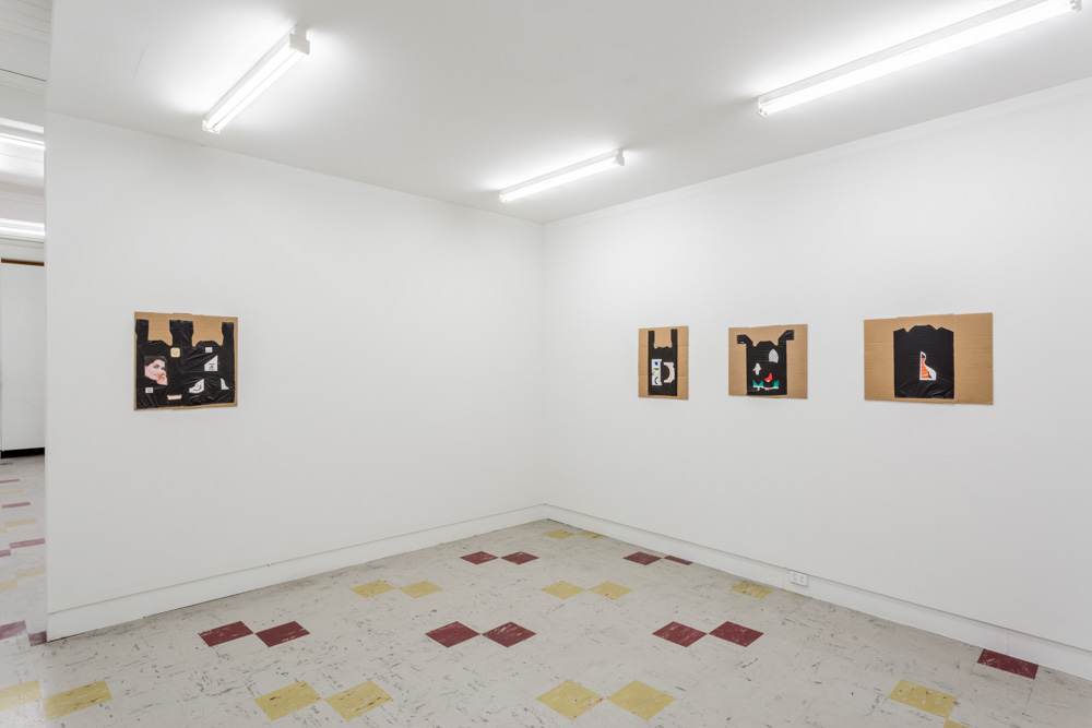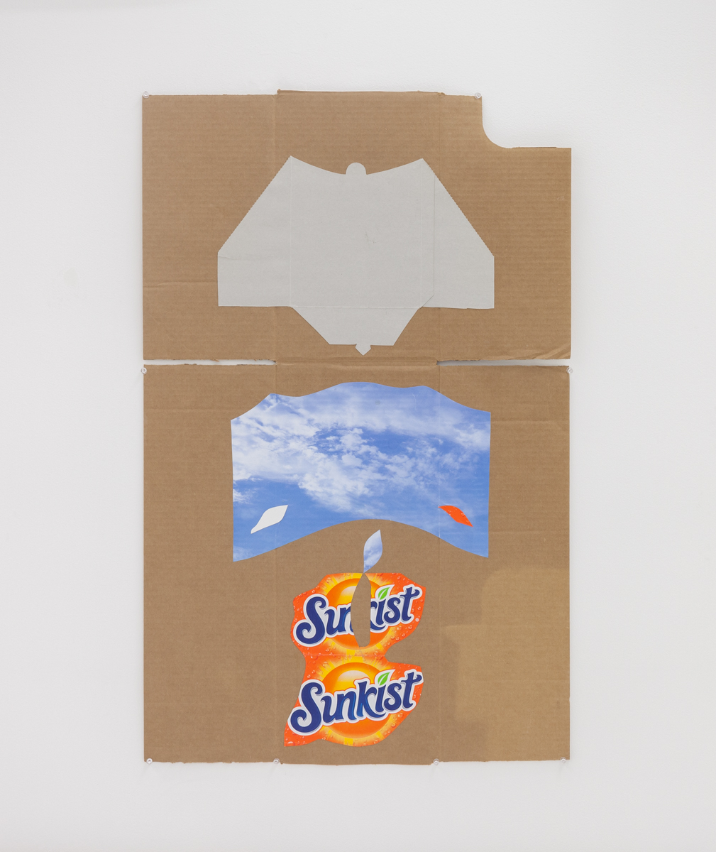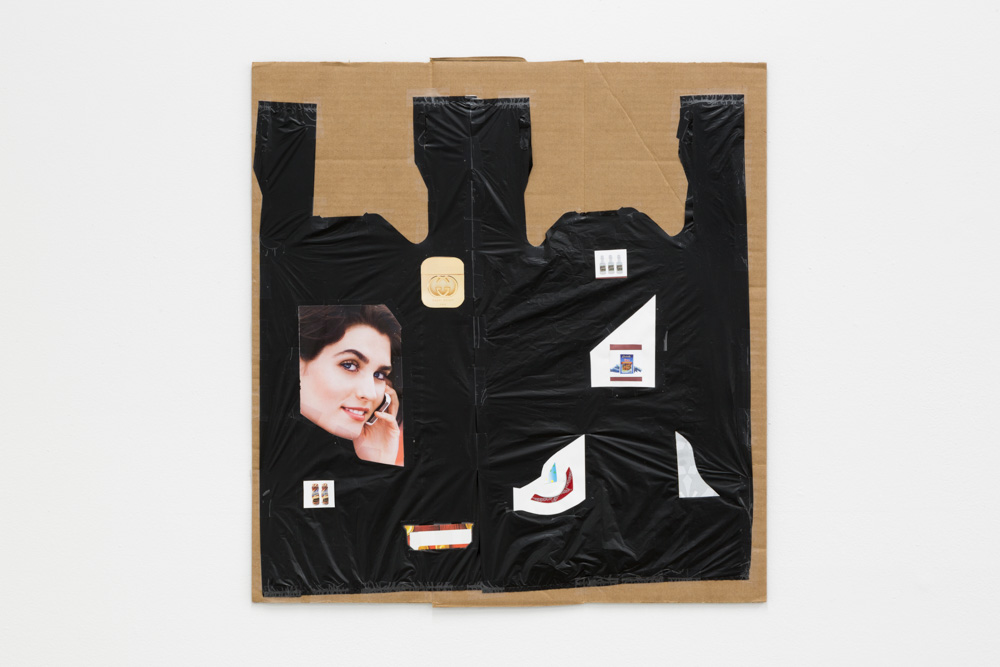 For this exhibition at TCB Art Inc. the formerly Melbourne-based artist Dan Miller, one of Kong's friends and collaborators, has worked with Kong to choose a selection of works from a recent series. These collages on black plastic shopping bags and packing cardboard turn common symbols of American consumption into complex props, nuanced in their treatment of the natural and the synthetic.