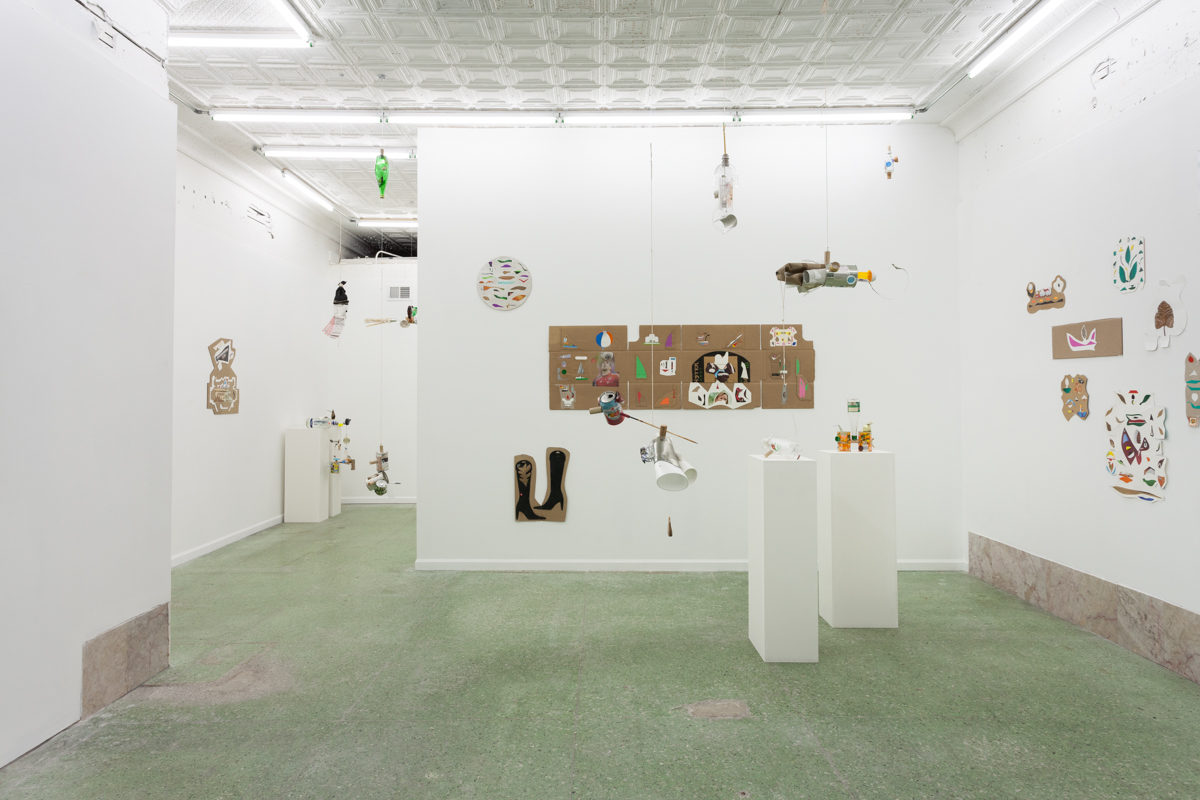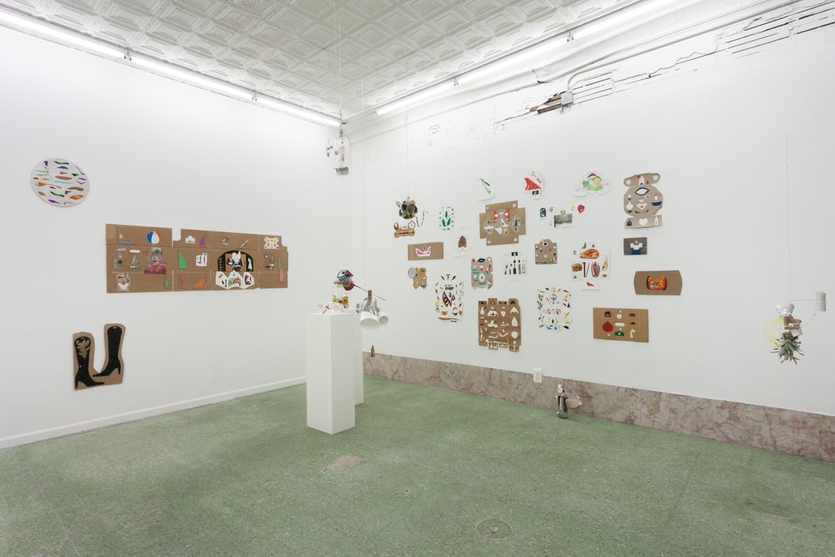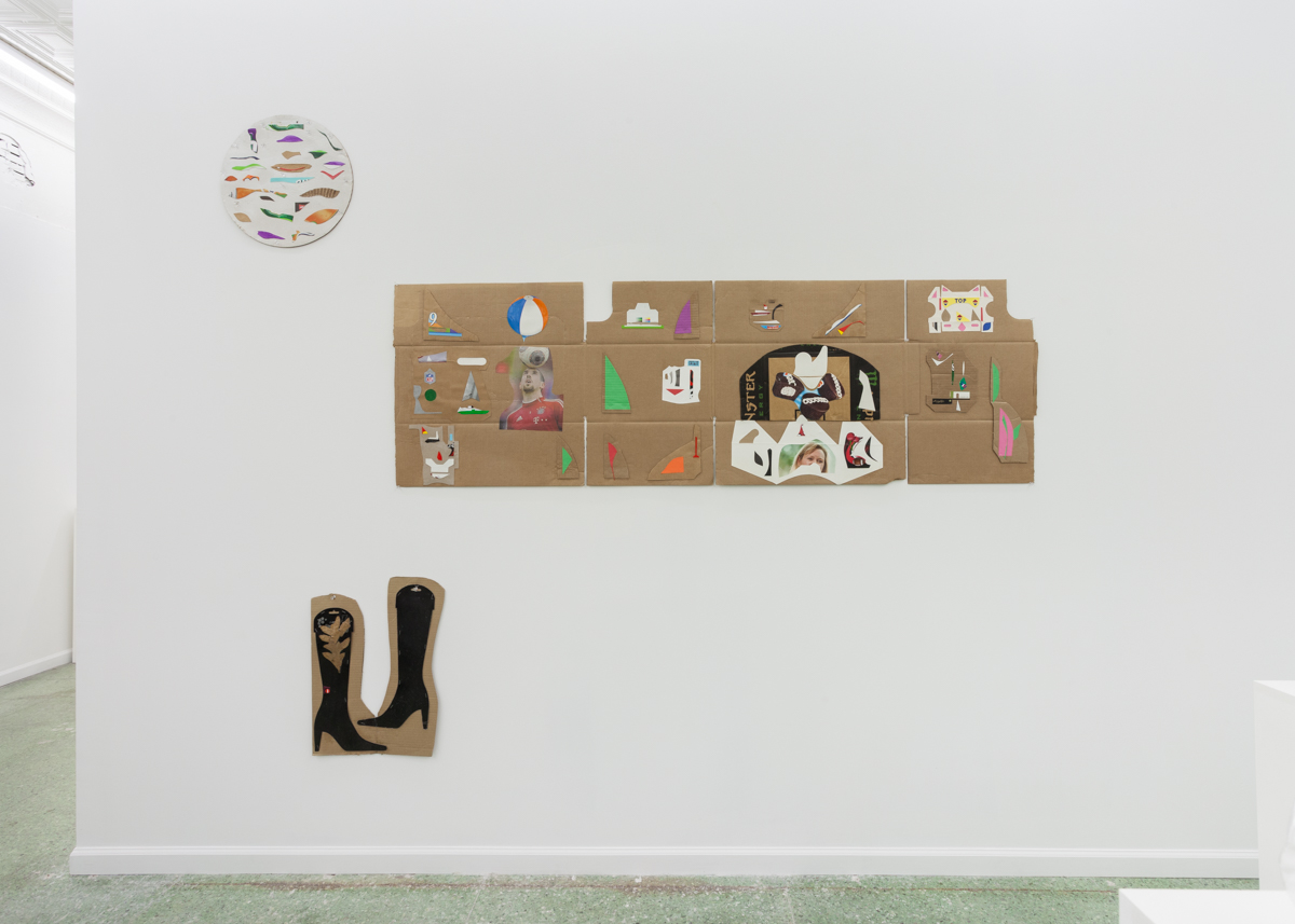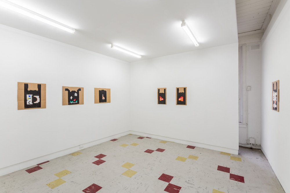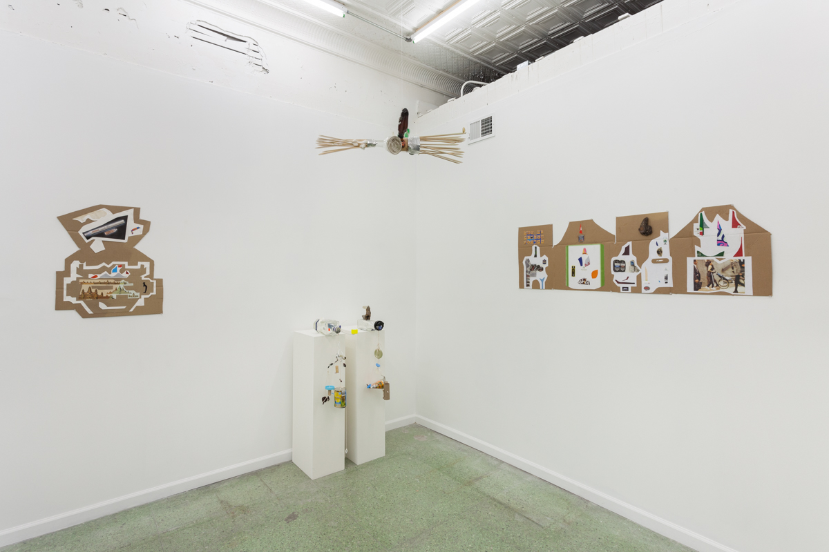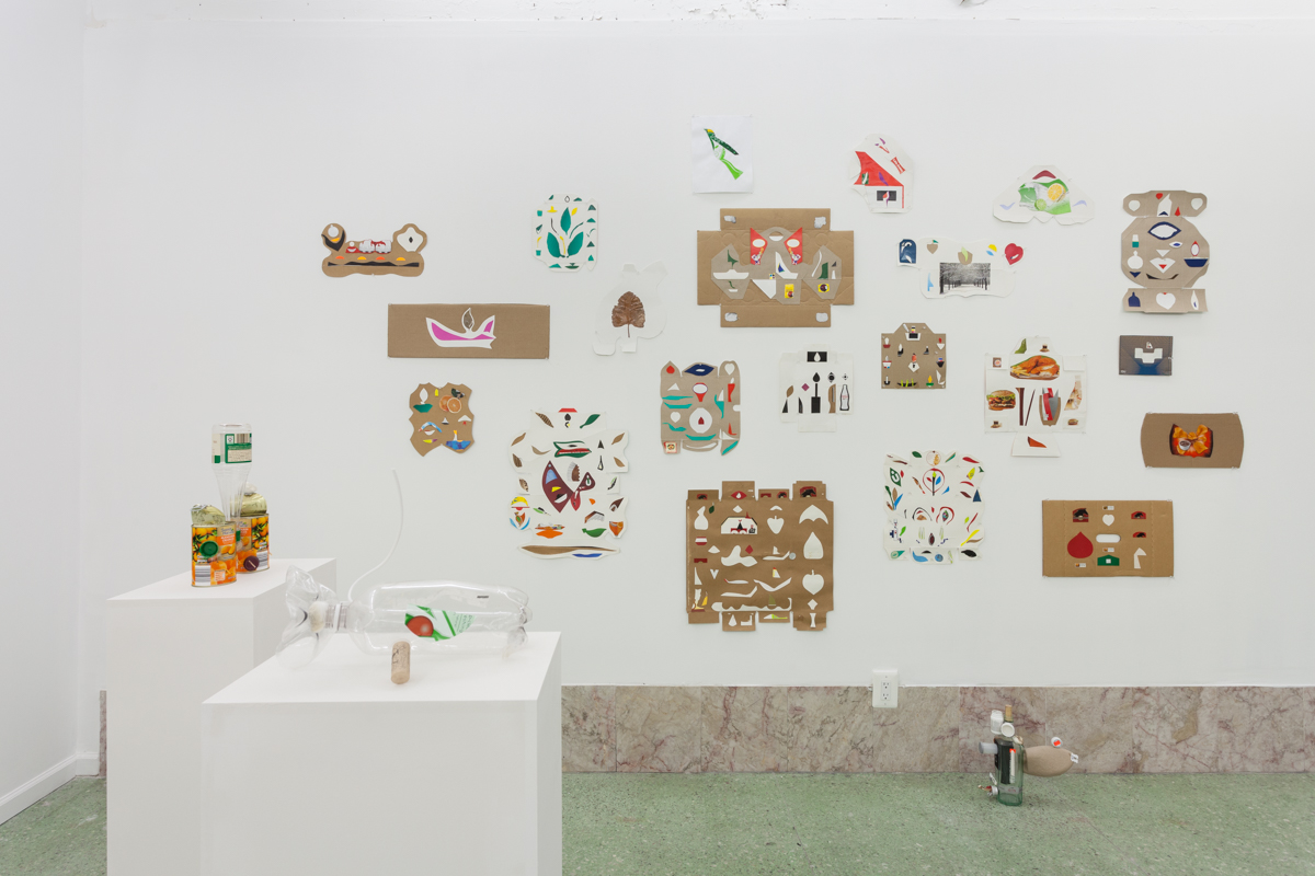 For this exhibition at TCB Art Inc. the formerly Melbourne-based artist Dan Miller, one of Kong's friends and collaborators, has worked with Kong to choose a selection of works from a recent series. These collages on black plastic shopping bags and packing cardboard turn common symbols of American consumption into complex props, nuanced in their treatment of the natural and the synthetic.